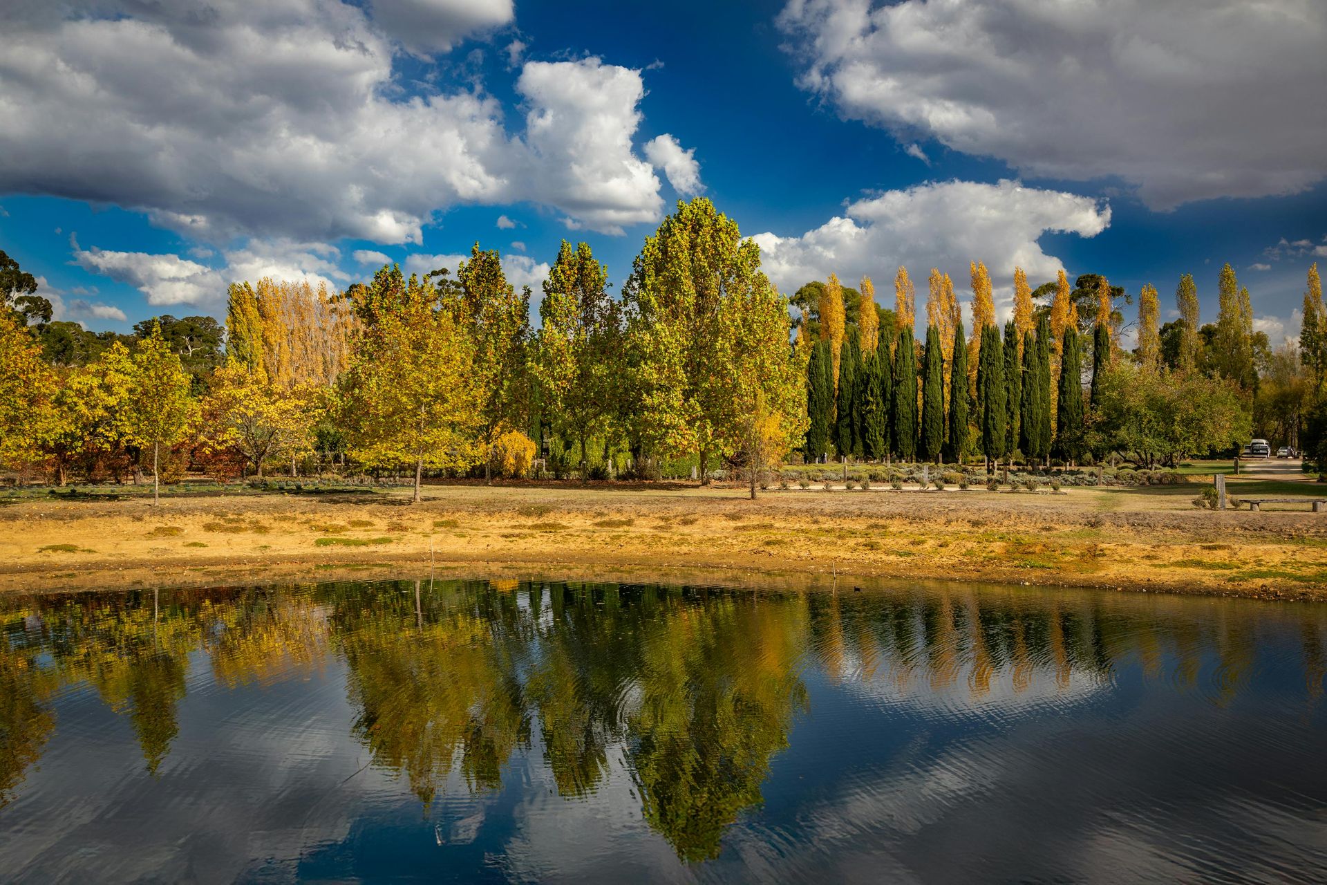 - Light afternoon breeze moving through mature trees along the greenbelt